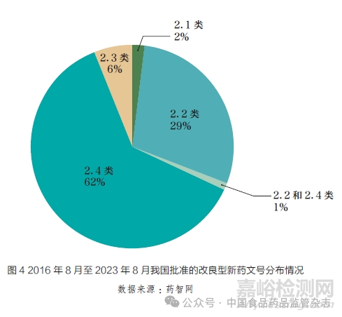 我國對2 類改良型新藥的臨床優(yōu)勢有明確的要求,相關(guān)注冊申請通過率較低。本文基于國家藥品監(jiān)督管理局藥品審評中心(Center for Drug Evaluation,CDE)歷年發(fā)布的藥品審評報告數(shù)據(jù)進行了統(tǒng)計分析,2016~2023 年,CDE共受理了1496個改良型新藥的IND,僅有278個進入NDA 階段,其中有165個審結(jié)并建議批準(zhǔn)(表2)。另基于藥智網(wǎng)數(shù)據(jù)分析發(fā)現(xiàn),2016 年6 月至2023年8月,共有148個改良型新藥文號獲批,其中2.1類3個,2.2類42個,2.3類9個,2.4類92個,2.2和2.4類2個,分別約占2%、29%、6%、62% 和1%(圖4)。與美國505(b)(2) 產(chǎn)品相比,我國改劑型、改配方的產(chǎn)品比重較低,新適應(yīng)癥產(chǎn)品比重較高。