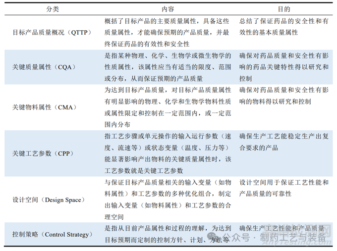 QbD 理念中主要包含以下元素:目標(biāo)產(chǎn)品質(zhì)量概況(QTTP)、關(guān)鍵質(zhì)量屬性(CQA)、關(guān)鍵物料屬性(CMA)、關(guān)鍵工藝參數(shù)(CPP)、設(shè)計(jì)空間(Design Space)、控制策略(Control Strategy)[5](見表1)。