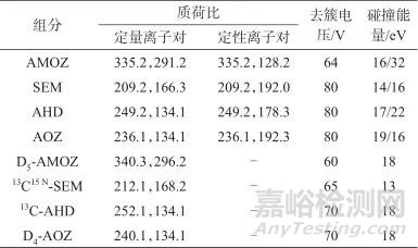 表1 硝基呋喃代謝物的質(zhì)譜檢測參數(shù)