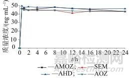 混合標準儲備溶液:量取AMOZ、SEM、AHD、AOZ混合標準溶液0.1 mL,置于100 mL容量瓶中,用甲醇稀釋至標線,制成100 ng/mL的混合標準儲備溶液。