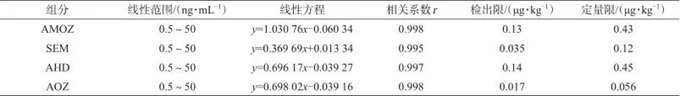 表3 硝基呋喃化合物的線性范圍、線性方程、相關(guān)系數(shù)、檢出限與定量限