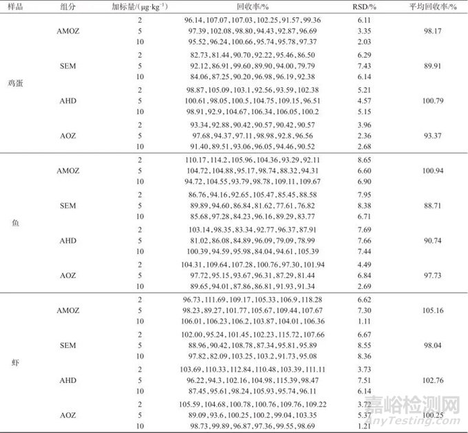 稱取雞蛋、魚、蝦等陰性樣品各2 g,分別加入100 ng/mL混合標準儲備溶液0.02、0.05、0.1 mL (分別相當于2、5、10 μg/kg的硝基呋喃代謝物),加入100 ng/mL混合內(nèi)標溶液0.05 mL,按照1.3方法處理,在1.2儀器工作條件下測定樣品中的殘留量,加標回收與精密度試驗結(jié)果見表4,由表4可知,以上三種基質(zhì)樣品中加標回收率為88.71~105.16 %,測定結(jié)果的相對標準偏差(RSD)為3.12~9.08%(n=6),表明該方法準確度良好。