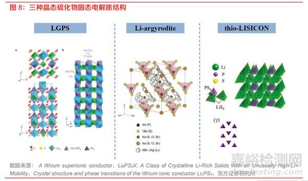 晶態(tài)的硫化物固態(tài)電解質(zhì)通常經(jīng)過高能球磨后高溫?zé)Y(jié)獲得,也有部分研究采用高能球磨、研磨 后燒結(jié)及液相法制備得到。晶態(tài)的硫化物固態(tài)電解質(zhì)按晶體結(jié)構(gòu)主要分為 thio-LISICON 型、Liargyrodite 型和 LGPS 型。這三種類型的電解質(zhì)都有具體的晶體結(jié)構(gòu)和鋰離子傳輸通道,其結(jié)構(gòu)組成和離子遷移機(jī)理都較為明確。