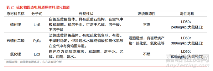 穩(wěn)定性為制約硫化物固態(tài)電解質(zhì)規(guī)模應(yīng)用的重要瓶頸。晶態(tài)的硫化物固態(tài)電解質(zhì)擁有很高的離子電導(dǎo)率,趕上甚至超過液態(tài)電解液,因此對于硫化物電解質(zhì)來說,離子電導(dǎo)率不再是應(yīng)用于固態(tài)電池的關(guān)鍵制約因素,空氣穩(wěn)定性和電化學(xué)穩(wěn)定性才是制約其規(guī)模應(yīng)用的瓶頸。如合成硫化物電 解質(zhì)的原材料 Li2S 和 P2S5,均存在空氣穩(wěn)定性較差的問題,需要在充滿惰性氣體、無水無氧的環(huán)境中生產(chǎn),設(shè)備要求大幅提升。此外,生產(chǎn)過程中將產(chǎn)生有毒的硫化氫,必須進(jìn)行回收處理,以防止泄漏造成安全風(fēng)險。