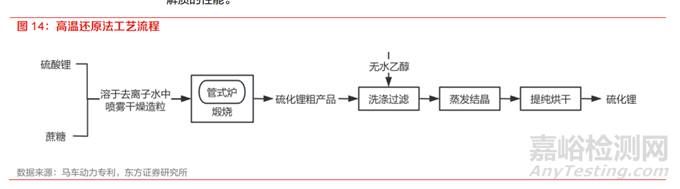 該方法的主要思路為將含硫鋰鹽和還原劑混合后高溫?zé)Y(jié)制備硫化鋰,又可以稱為固相燒結(jié)法。含硫鋰鹽通常為硫酸鋰,還原劑可選蔗糖,反應(yīng)方程式為 C12H22O11→12C+11H2O,Li2SO4+2C →Li2S+2CO2。其制備過程如下:①將硫酸鋰和蔗糖按比例溶于去離子水中,然后噴霧干燥造粒;②造粒得到的粉末在管式爐中 750℃煅燒 15h ,得到硫化鋰粗產(chǎn)品;③硫化鋰粗產(chǎn)品用無水乙醇洗滌過濾不溶的硫酸鋰和碳粉,然后將濾液蒸發(fā)結(jié)晶提純后烘干,即得到硫化鋰,純度 99.4%。該方法所采用的原材料便宜且常規(guī),工藝流程簡單,無有害氣體產(chǎn)生,且有效利用了高溫高壓密閉反應(yīng)的優(yōu)勢,避免有害溶劑泄漏。但高溫高壓同樣增加了工況控制和設(shè)備選型的難度,并且在生產(chǎn)過程中會有大量的副產(chǎn)物 Li2O 產(chǎn)生,導(dǎo)致 Li2S 產(chǎn)品不純,最終影響使用 Li2S 的硫化物固態(tài)電 解質(zhì)的性能。