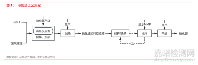 溶劑法是將鋰鹽混合在有機(jī)溶劑中,同時通入硫化氫氣體,在加熱狀態(tài)下反應(yīng)后除雜得到高純硫 化鋰,又可以稱為液相法,其反應(yīng)方程式為 LiOH+H2S→Li2S+H2O。有機(jī)溶劑多選用脂肪烴、芳香烴或醚溶劑等,比如乙醇、己烷、甲苯、乙醚、四氫呋喃、氮甲基吡咯烷酮等。