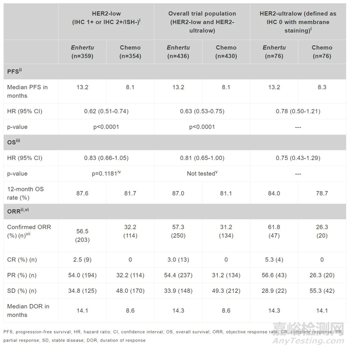 此外,預(yù)定的探索性分析顯示,在HER2低表達(dá)和HER2超低表達(dá)患者中,患者PFS的臨床顯著改善表現(xiàn)一致。在HER2超低表達(dá)患者中,Enhertu將疾病進(jìn)展或死亡風(fēng)險降低了22%,中位PFS為13.2個月,而化療組為8.3個月(HR=0.78;95% CI:0.50-1.21)。在Enhertu組中觀察到13例完全緩解,包括9例HER2低表達(dá)患者。在HER2超低表達(dá)亞組中,Enhertu組有4例完全緩解,而在化療組中沒有觀察到完全緩解。詳細(xì)數(shù)據(jù)請見下表: