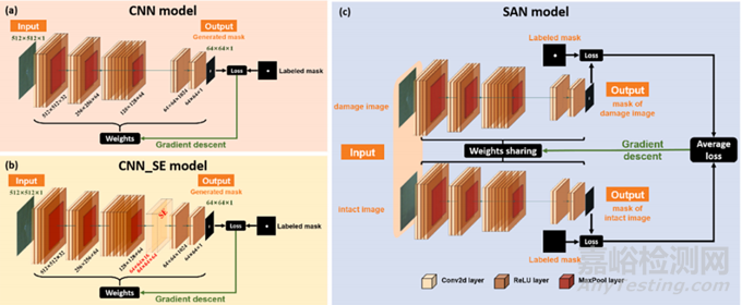 圖6 三個(gè)比較模型的結(jié)構(gòu)(a)CNN,(b)CNN_SE,(c)SAN。
