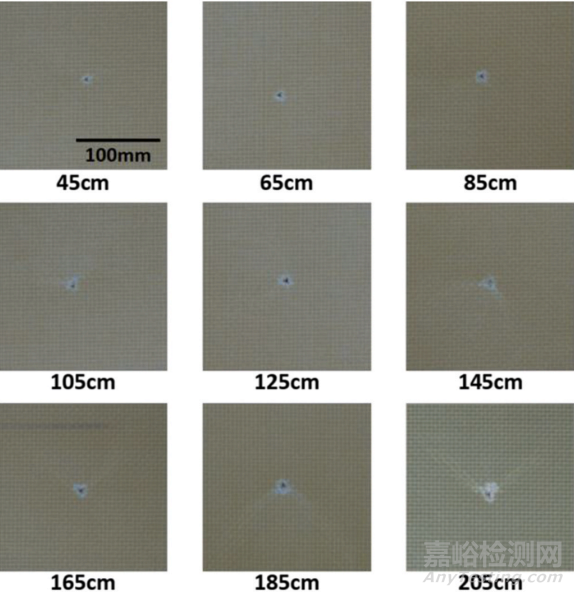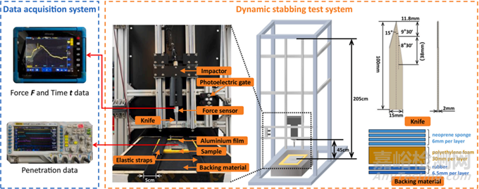 研究使用了 SPFCT-2000 刺擊阻力服性能測(cè)試儀,測(cè)試中設(shè)置了九個(gè)不同的下落高度,從 45 厘米到 205 厘米,間隔為 20 厘米,以模擬不同的沖擊能量。樣品固定在由多層不同材料組成的支撐板上,使用光電門記錄刀片接觸樣品時(shí)的初始速度,并據(jù)此計(jì)算沖擊動(dòng)能。實(shí)驗(yàn)中還設(shè)置了數(shù)據(jù)采集系統(tǒng),采用力傳感器收集刀片在刺穿過程中的沖擊力變化,定義穿透為刀尖完全穿過芳綸纖維增強(qiáng)復(fù)合材料層并在樣品背面出現(xiàn)。通過在樣品的不同層放置鋁膜并與數(shù)據(jù)采集系統(tǒng)連接,可以確定刀片穿透的層數(shù)。實(shí)驗(yàn)結(jié)果表明,隨著刀片下落高度的增加,刀片速度、穿透層數(shù)和峰值穿刺力也隨之增加。
