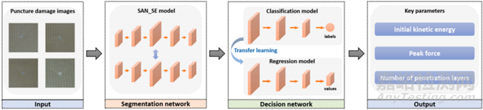 防刺服在個(gè)人防護(hù)方面發(fā)揮著重要作用。在防刺領(lǐng)域,傳統(tǒng)方法通常使用已知的沖擊條件來評(píng)估防刺材料的保護(hù)性能和損傷。然而,這些方法無法從已知的損傷中回溯沖擊信息,這使得難以確定沖擊體的特征。本研究介紹了一種新的穿刺損傷預(yù)測(cè)模型,該模型能夠在各種穿刺條件下,僅根據(jù)表面損傷圖像預(yù)測(cè)芳綸防刺織物的沖擊動(dòng)能、峰值穿刺力和穿透層數(shù)。首先,通過動(dòng)態(tài)穿刺試驗(yàn)和圖像采集系統(tǒng)獲得了不同的穿刺損傷圖像及其相應(yīng)的參數(shù)。其次,本研究開發(fā)了一種分割網(wǎng)絡(luò)(命名為 SAN_SE 模型),克服了纖維增強(qiáng)復(fù)合材料表面紋理的復(fù)雜性,并實(shí)現(xiàn)了損傷區(qū)域的精確分割。訓(xùn)練損失穩(wěn)定在 1.5 × 10−4。然后構(gòu)建了一個(gè)分類模型,以建立圖像和穿刺參數(shù)之間的關(guān)系,隨后應(yīng)用遷移學(xué)習(xí)從分類模型中導(dǎo)出一個(gè)回歸模型。該回歸模型的誤差低于 6%。最后,構(gòu)建了一個(gè)實(shí)時(shí)穿刺損傷預(yù)測(cè)系統(tǒng),將此穿刺損傷預(yù)測(cè)模型應(yīng)用于實(shí)際損傷場(chǎng)景。該系統(tǒng)在預(yù)測(cè)穿透層數(shù)方面實(shí)現(xiàn)了 88.57% 的準(zhǔn)確率,并且能夠在 0.025 秒內(nèi)執(zhí)行單個(gè)圖像。本研究提出的穿刺損傷預(yù)測(cè)模型適用于醫(yī)療和軍事領(lǐng)域的實(shí)時(shí)監(jiān)控系統(tǒng),例如損傷評(píng)估和反偵察。
