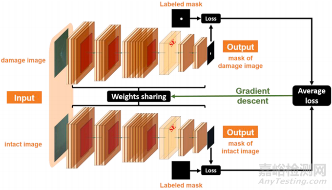 該文章提出了用于精準(zhǔn)定位和分割圖像樣本中穿刺損傷區(qū)域的分割網(wǎng)絡(luò)(SAN_SE模型)。該模型采用改進(jìn)的Siamese對(duì)抗網(wǎng)絡(luò)結(jié)構(gòu),包含兩個(gè)并行的相同卷積神經(jīng)網(wǎng)絡(luò)(CNN),和一個(gè)注意力機(jī)制層。在訓(xùn)練過程中,SAN_SE模型將一張穿刺損傷圖像和一張完好圖像同時(shí)輸入網(wǎng)絡(luò),通過比較生成的掩膜與數(shù)據(jù)集中的標(biāo)記掩膜來獲得損失值,并利用這些損失值進(jìn)行反向傳播以調(diào)整網(wǎng)絡(luò)參數(shù)。該模型通過結(jié)合正樣本和負(fù)樣本的輸入組合,有效解決了小樣本數(shù)據(jù)集中的樣本不平衡問題,并顯著提高了模型的學(xué)習(xí)效率和泛化能力。