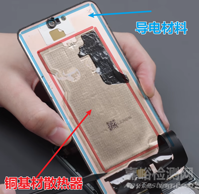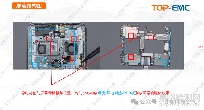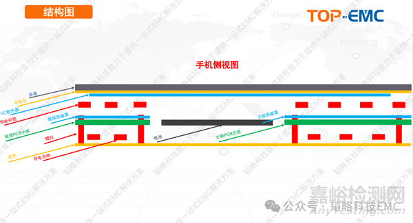 如上圖所示為手機側視簡圖,可以看到手機結構呈現(xiàn)多層三明治結構,底殼與屏形成較好的屏蔽結構。仔細觀察可以發(fā)現(xiàn)屏與主板和底殼通過一些金屬材料接觸,如下圖: