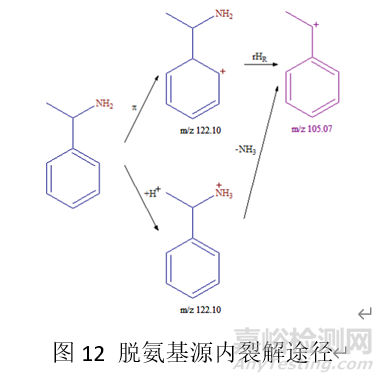 氨基取代化合物,在氨基上加氫、異裂脫去NH3,獲得分子離子峰和碎片例子(M+H-17)+,該碎片例子往往為基峰。常見裂解方式見圖12。