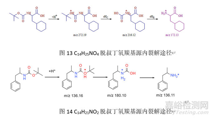 含有叔丁氧羰基的化合物往往很難發(fā)現(xiàn)分子離子峰,基峰往往為(M+1-100)+,以C14H25NO4和C14H21NO2為例,研究了其裂解路徑,其基峰(M+1-100)+為分子加氫、電子重排、脫去CO2后獲得,裂解過程見圖13、圖14。