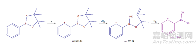 以C12H17BO2為例,其基峰為123.06,而不是205.14其源內(nèi)裂解方式見圖15。