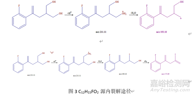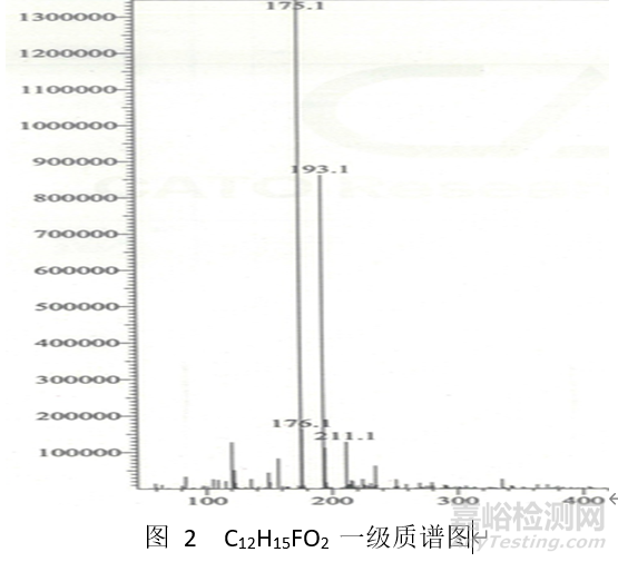 當(dāng)化合物含有一個或多個羥基時,容易異裂脫水獲得較大的脫水離子峰,此峰往往為基峰。例如目標(biāo)化合物C12H15FO2,該化合物結(jié)構(gòu)式見圖1,我們對其定性,判斷是否獲得目標(biāo)化合物。其一級質(zhì)譜圖見圖2,基峰為175.1(+),另外較大離子峰為193.1(+),而理論分子離子峰為211.1(+),通過解析,我們判斷193.1、175.1離子峰為依次脫去一分子水和兩分子水而得,其裂解規(guī)律見圖3。