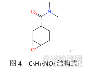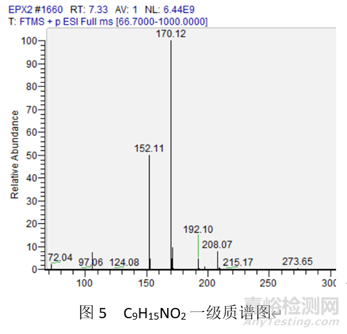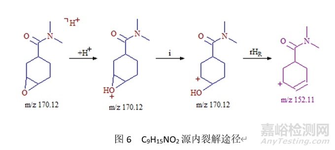環(huán)氧化物在氧原子上加H+,C-O鍵異裂后再脫水形成雙鍵。例如化合物C9H15NO2,其結(jié)構(gòu)式見圖4,對該化合物進行結(jié)構(gòu)確證,發(fā)現(xiàn)除分子離子峰(M+1)+ 170.12外,還獲另一較大峰152.11,質(zhì)譜圖見圖5,經(jīng)分析,該離子峰為脫水裂解峰,其裂解過程見圖6。