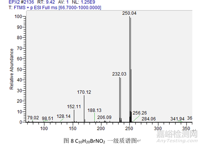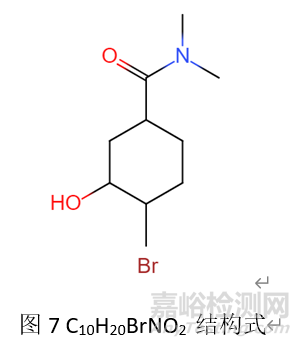 環(huán)上取代羥基,在氧原子上加H+,C-O鍵異裂后再脫水形成離子峰(M+H-18)+。例如化合物C10H20BrNO2,其結(jié)構(gòu)式見圖7;對該化合物進行結(jié)構(gòu)確證,發(fā)現(xiàn)除分子離子峰(M+1)+ 250.04外,還獲另一較大峰232.03,質(zhì)譜圖見圖8,經(jīng)分析,該離子峰為脫水裂解峰,其裂解過程見圖9。