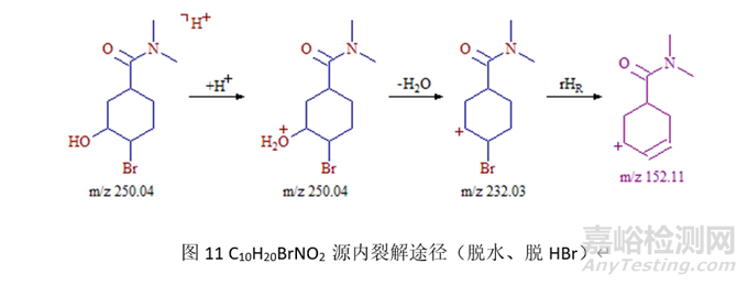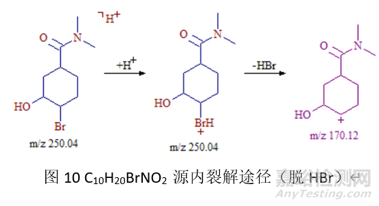 取代鹵化物,在鹵原子上加氫后,異裂脫去鹵化氫,獲得碎片例子。例如圖8中,出現(xiàn)了170.12的粒子峰,經(jīng)分析,該離子為(M+H-HBr)+,其裂解途徑見圖10。而圖9中出現(xiàn)的152.11的離子峰,是脫水、脫HBr共同作用的結(jié)果。其裂解途徑見圖11。
