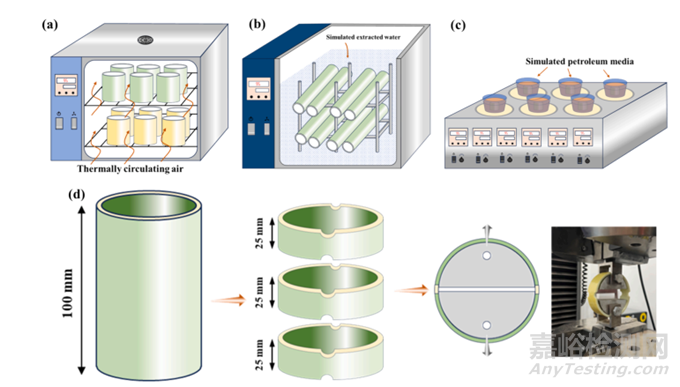 圖 1. 玻璃纖維增強(qiáng)塑料管材老化試驗(yàn)流程示意圖;(a)循環(huán)空氣中的熱氧老化,(b)模擬采出水熱老化,(c)模擬石油熱老化,(d)分離圓盤法的環(huán)向強(qiáng)度測(cè)試。