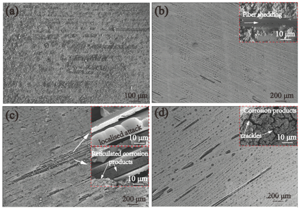 斷口分析結(jié)果表明初始狀態(tài)玻璃纖維和環(huán)氧樹脂基體之間有很強(qiáng)的結(jié)合,因?yàn)樵诶w維周圍可以看到大量的樹脂包覆,纖維斷口幾乎在同一平面。但在后續(xù)的老化樣品中情況則有所不同,它們的斷口愈發(fā)雜亂和交錯(cuò),這些斷裂模式包括纖維斷裂、基體開裂和纖維基體脫膠。斷裂的玻纖大多以單獨(dú)的狀態(tài)出現(xiàn),表面并沒有包裹樹脂層,樹脂與玻纖形成相互獨(dú)立的體系兩者的粘接強(qiáng)度顯著減弱。尤其在水熱和油老化環(huán)境下,基體樹脂開裂明顯,玻纖在較大的長度范圍內(nèi)被拔出,這對(duì)提升纖維復(fù)合材料的抗載性能是明顯不利的。