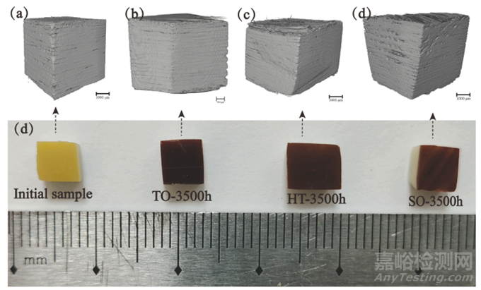 圖 3. 不同狀態(tài)下樣品的真實(shí)形態(tài)與計(jì)算機(jī)斷層掃描的3D圖像的對(duì)比:(a)原始狀態(tài);(b)3500小時(shí)的熱氧化老化;(c)3500小時(shí)水熱老化;(d)3500小時(shí)模擬油老化。