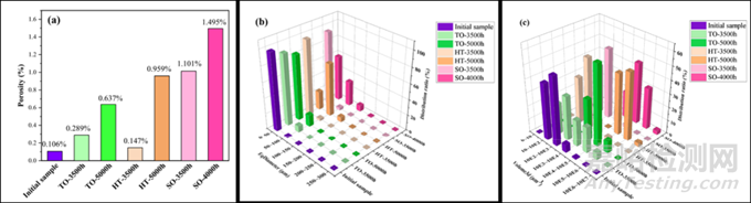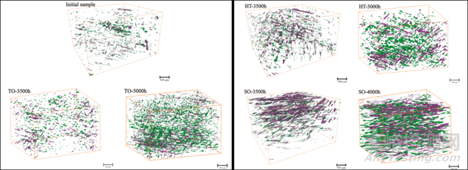 圖 4. 不同條件下老化樣品的計(jì)算機(jī)斷層掃描孔提取結(jié)果對(duì)比。