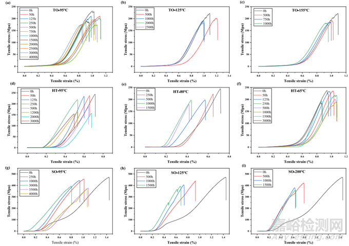 圖 6. 三種老化環(huán)境的典型應(yīng)力-應(yīng)變曲線:(a)(b)(c)熱氧環(huán)境,(d)(e)(f)水熱環(huán)境,(g)(h)(i)模擬石油環(huán)境。