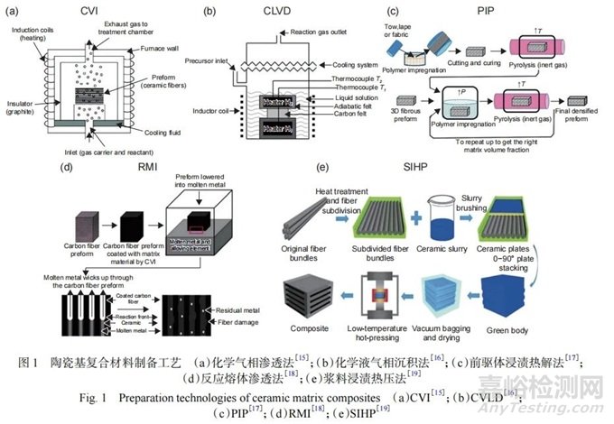 目前,陶瓷基復合材料的制備方法主要有化學氣相滲透法(chemical vapor infiltration,CVI)、反應熔體滲透法(reaction melt infiltration,RMI)、漿料浸漬熱壓法(slurry impregnation and hot pressing,SIHP)、前驅(qū)體浸漬熱解法(precursor impregnation pyrolysis,PIP)、化學液氣相沉積法(chemical liquid-vapor deposition,CLVD)以及混合工藝等(圖1)[15-19]。CVI工藝是將碳纖維預成型體置于沉積爐中,源氣通過擴散或由壓力差產(chǎn)生的定向流動輸送至預成型體周圍后再向其內(nèi)部擴散,在纖維表面發(fā)生化學反應并原位沉積。根據(jù)流場和溫度場的特征,CVI可分為等溫化學氣相浸滲、熱梯度強制對流化學氣相浸滲、壓力梯度化學氣相浸滲和脈沖化學氣相浸滲。RMI又叫作熔融滲硅法,其工藝流程是在高溫真空環(huán)境下將熔融Si滲入到纖維預制體增強多孔碳中,使Si熔體與碳基體反應生成SiC基體,該工藝可以通過調(diào)整纖維預制體增強多孔碳的體積密度和孔隙率控制最終復合材料的密度。SIHP工藝流程是將SiC粉、燒結(jié)助劑與有機黏結(jié)劑等和溶劑混合制成料漿,碳纖維經(jīng)料漿浸漬后紡制成無緯布,切片模壓成型后熱壓燒結(jié)進而得到最終的復合材料。其工藝較簡單、制備周期短、成本低且接近凈尺寸成型。PIP工藝是在一定溫度和壓力下以碳纖維預制件為骨架,采用有機先驅(qū)體溶液或熔融體進行浸漬,待固化后在惰性氣體下進行高溫裂解進而轉(zhuǎn)化為SiC陶瓷基體。然而由于先驅(qū)體裂解過程會釋放大量分子,導致基體體積收縮,因此為了獲得更致密的基體需要進行多次重復浸漬熱解。CLVD是一種可以快速致密化的制備工藝,通過加熱排出預制體內(nèi)部的前驅(qū)體可以在脈沖間隔時間內(nèi)被補充,從而纖維束間和層間的間隙可以被很好地致密化,進而獲得均勻的陶瓷基體。CLVD可以有效避免化學氣相滲透法中的表面結(jié)殼現(xiàn)象,且制備速率是其兩倍之多[20]。