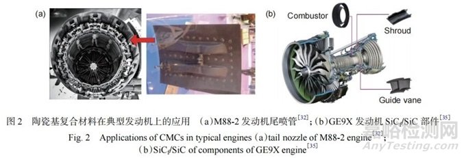 法國賽峰(Snecma)公司作為航空發(fā)動機制造領(lǐng)域最具影響力的企業(yè)之一,生產(chǎn)的陶瓷基復合材料噴嘴襟翼在幻影2000的M53-2發(fā)動機上首次安裝使用[30],這也是首次在軍用領(lǐng)域應用陶瓷基復合材料。這款發(fā)動機主要服務(wù)于多款空軍戰(zhàn)機,包括最新的幻影2000-5和2000-9多用途戰(zhàn)斗機等。同時,賽峰公司聯(lián)合歐洲推進公司(SEP)開發(fā)出編號為SEPCARBINOX A262的C/SiC復合材料,該材料的制備過程主要采用新型的自愈合技術(shù)和多層編織增強材料,以提高陶瓷基復合材料的耐溫性能和使用壽命[31]。SEPCARBINOX A262在完成目標壽命為1000h的耐久性實驗后,獲得用于M88型號發(fā)動機外襟翼的資格,并批量化生產(chǎn)。該材料首次應用在達索陣風的M88-2渦扇發(fā)動機上(圖2(a))[32],旨在實現(xiàn)發(fā)動機的高推重比、低油耗以及長壽命。賽峰公司在軍用發(fā)動機領(lǐng)域獲得陶瓷基復合材料大量應用經(jīng)驗后,在2000年開始專注于陶瓷基復合材料在商用發(fā)動機的使用,并在CFM56發(fā)動機中測試了不同的陶瓷基復合材料部件。賽峰公司設(shè)計的SiCf/Si-B-C復合材料最終在BR710-715、PW500、RB211等發(fā)動機應用,并在CFM56-5C發(fā)動機上進行了首次測試,經(jīng)歷過600次循環(huán)和200h的發(fā)動機運行時間后,證明了SiC/Si-B-C復合材料具備良好的可靠性[32]。