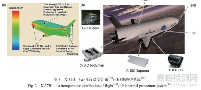 X-37B項目標志著美國在航天領(lǐng)域的又一項里程碑。作為一種技術(shù)驗證機,X-37B的設(shè)計目標是測試并證明高可靠性、可重復使用的無人空間機動飛行器的關(guān)鍵技術(shù)。該飛行器的外觀和飛行剖面繼承了美國航天飛機的設(shè)計理念,但在技術(shù)上進行創(chuàng)新和改進以適應未來空間探索的需求,其最大飛行速度約為25馬赫,圖3(a)為X-37B的飛行溫度分布[43]。X-37項目作為一項重要的技術(shù)驗證計劃,旨在推動空天探索領(lǐng)域的技術(shù)創(chuàng)新。其中,近40項技術(shù)驗證包括了多個關(guān)鍵領(lǐng)域,其中尤為引人注目的是先進熱防護系統(tǒng)。這一領(lǐng)域的創(chuàng)新對于保障飛行器在高溫和高速飛行中的安全至關(guān)重要。為了實現(xiàn)這一目標,X-37項目采用新型的熱結(jié)構(gòu)材料,這些材料具有出色的高溫性能和抗氧化特性。同時,項目還應用先進的熱防護結(jié)構(gòu)設(shè)計技術(shù),以確保飛行器能夠有效地應對極端的熱環(huán)境。這種熱防護系統(tǒng)的創(chuàng)新性將為未來飛行器的高速發(fā)展提供寶貴的經(jīng)驗和技術(shù)支持。