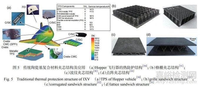 程度上取決于所處位置的最高溫度,如圖5(a)所示[50]。具備輕質(zhì)高強的耐高溫陶瓷基復合材料為實現(xiàn)輕量化及熱防護需求提供強力保障,同時一體化熱防護結(jié)構(gòu)是將輕質(zhì)承載結(jié)構(gòu)與防隔熱材料進行整體設(shè)計,這種結(jié)構(gòu)大大減輕飛行器的質(zhì)量并有效提高熱防護能力[3]。夾芯結(jié)構(gòu)具有高比強度、高比剛度以及優(yōu)秀能量吸收等特點,通過設(shè)計開孔和排布方式進而填充防隔熱材料,可以有效實現(xiàn)承載和熱防護的功能一體化。夾芯結(jié)構(gòu)是由上下面板及中間芯層組成,根據(jù)芯層種類可以分為點陣夾芯結(jié)構(gòu)、波紋夾芯結(jié)構(gòu)和格柵夾芯結(jié)構(gòu)等,如圖5(b)~(d)所示[51-53]。