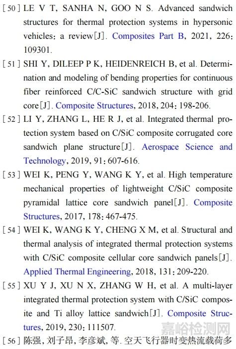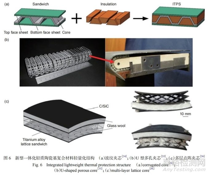 制備陶瓷基復合材料夾芯結(jié)構(gòu)的流程主要包括兩個步驟:選擇合適的陶瓷基體與增強纖維制備出復合材料預制體,然后經(jīng)過炭化和陶瓷化后獲得陶瓷基復合材料夾芯結(jié)構(gòu)。Shi等[51]采用液相滲硅工藝制備出C/C-SiC復合材料格柵結(jié)構(gòu),在1650℃下實現(xiàn)C/C夾層的硅化。Li等[52]采用前驅(qū)體浸漬熱解法和熱壓成型制備C/SiC復合材料波紋夾芯結(jié)構(gòu),建立C/SiC復合材料波紋夾芯板的等效導熱系數(shù)預測方法。Wei等[53]研制出可在1600℃下使用的C/SiC金字塔型點陣夾芯結(jié)構(gòu),系統(tǒng)評估了陶瓷基點陣結(jié)構(gòu)在高溫下的力學性能?;谔沾苫鶑秃喜牧蠆A芯結(jié)構(gòu)的力學響應機制及傳熱原理,眾多科研工作者開始探索一體化防隔熱結(jié)構(gòu)的設(shè)計,如圖6所示[54-56]。Wei等[54]制備了波紋、金字塔型及改進金字塔型3種含有隔熱材料的新型熱防護結(jié)構(gòu),并在典型的氣動熱和氣動壓力下確定出可滿足力熱耦合環(huán)境的結(jié)構(gòu)尺寸。Xu等[56]創(chuàng)新性地提出一種多層點陣熱防護結(jié)構(gòu)設(shè)計方法,上中下層面板均采用C/SiC陶瓷基復合材料面板,上層芯和下層鈦合金晶格芯均填充隔熱玻璃棉,研究發(fā)現(xiàn)這種新型熱防護結(jié)構(gòu)具有優(yōu)異的輕質(zhì)承載和防隔熱性能。陶瓷基復合材料輕量化結(jié)構(gòu)給載荷識別與測量帶來了一定挑戰(zhàn),需要充分考慮面板,芯子對外部力熱載荷分布的影響。陳強等[57]提出一種改進共軛梯度法的時變熱流載荷反演方法,通過對一體化熱防護結(jié)構(gòu)進行數(shù)值模擬仿真分析各影響因素對反演精度和效率的影響。結(jié)果表明在提高反演精度的同時計算效率也有所提高,為熱防護結(jié)構(gòu)空間熱流載荷的計算提供了指導。