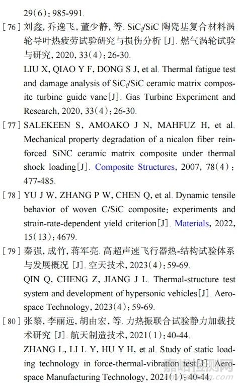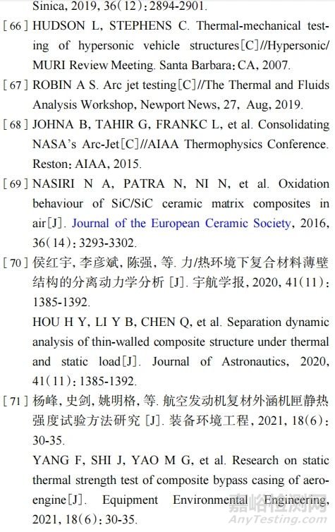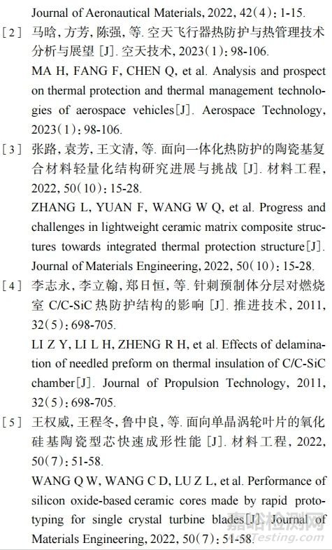 在面向飛行器的設(shè)計與評估需求中,進行各類地面熱結(jié)構(gòu)實驗是確保陶瓷基復合材料結(jié)構(gòu)能夠滿足服役要求的至關(guān)重要的一環(huán)。熱結(jié)構(gòu)實驗的目標是全面評估實驗對象在復雜高溫環(huán)境下的熱力學特性,包括多個關(guān)鍵方面。首先,實驗在具有一定空間和時間分布特征的高溫熱環(huán)境中進行,旨在考核實驗對象的熱防護性能,包括對其防熱和隔熱等關(guān)鍵特性的評估。在真實且具有挑戰(zhàn)性的熱環(huán)境中進行測試,能夠更全面地了解實驗對象在高溫條件下的表現(xiàn)??紤]到飛行器可能面臨的多樣化載荷形式,實驗需要在熱環(huán)境工況下同時施加靜態(tài)和動態(tài)等力載荷形式,熱強度實驗有助于評估實驗對象的靜強度、剛度等關(guān)鍵特性,確保其能夠在實際操作中穩(wěn)健地承受各種力的作用,從而提高整體性能。鑒于載荷特征和服役環(huán)境的復雜性,熱疲勞和熱沖擊實驗被引入,以更全面地評估陶瓷基復合材料的性能。熱疲勞實驗旨在測試實驗對象在長時間高溫環(huán)境下的穩(wěn)定性,而熱沖擊實驗則側(cè)重于極端溫度變化條件下的可靠性。這兩種實驗方法有效地模擬了飛行器在實際使用中可能面臨的極端熱力環(huán)境,為材料的可靠性提供有力的驗證。此外,地面實驗還包括力、熱、振動、噪聲等多種耦合環(huán)境,以更真實地模擬飛行器的實際服役環(huán)境。在多場耦合環(huán)境中進行綜合實驗,能夠為陶瓷基復合材料的結(jié)構(gòu)設(shè)計提供更全面、可靠的性能數(shù)據(jù),確保其在各種極端條件下能夠安全可靠地運行。