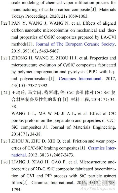 C/C-SiC是具有碳和碳化硅雙基體的一種陶瓷基復合材料,有著更為優(yōu)異的耐高溫、耐磨損以及抗氧化性能,適用于飛行器中的高溫熱防護材料和摩擦材料。采用化學氣相滲透法和前驅(qū)體浸漬熱解法相結(jié)合的工藝可以快速高效地制備連續(xù)纖維增強C/C-SiC陶瓷基復合材料[24-26]。王玲玲等[24]采用這種工藝成功制備了不同密度的C/C-SiC材料,高孔隙率C/C多孔體可以得到較高SiC含量的C/C-SiC復合材料,同時制備過程中氧化產(chǎn)生的SiO2可以附著在表面阻止氧化氣體向內(nèi)擴散,提高其抗氧化燒蝕能力。