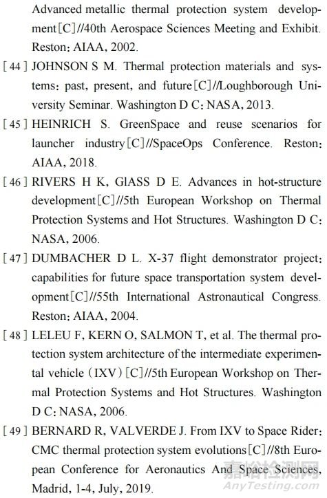 美國航天飛機在發(fā)射升空和再入大氣層過程中,表面不同部位分別承受320~1450℃的高溫環(huán)境,所以各個部件須采取不同的隔熱保護措施,以確保主體結(jié)構(gòu)的溫度在可控范圍內(nèi)。在航天飛機的迎風面,由于高速飛行產(chǎn)生的摩擦和氣動熱,面臨著極端的高溫環(huán)境[41]。為了保護飛行器免受極端溫度的侵害,陶瓷隔熱瓦的引入解決了這一挑戰(zhàn),其出色的隔熱性能成為航天領(lǐng)域的重要突破,這也為后續(xù)進行飛行器熱防護系統(tǒng)研究奠定了基礎(chǔ)。隨著高速飛行器的快速發(fā)展,更為惡劣的熱環(huán)境問題隨之而來:X-30A機翼前緣的溫度預計將達到1926℃;X-33再入溫度預計最高為1175℃,防熱板預計會受到超過1000℃的高溫,頭錐部的最高溫度預計可達1200℃;X-37B在外形上與美國航天飛機很相似,但其氣動外形幾何尺寸更?。s是航天飛機的1/4),再入速度高達25馬赫,其氣動熱更為嚴重[42]。為滿足飛行器在高溫熱環(huán)境下能夠穩(wěn)定運行,必須開發(fā)能夠作為熱屏障的新型陶瓷基熱防護復合材料。