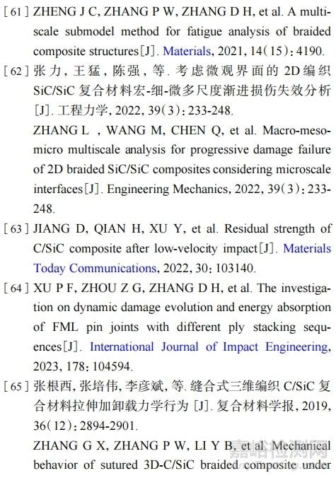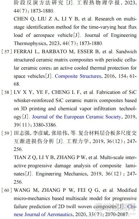 除此之外,陶瓷基復合材料輕量化結(jié)構(gòu)在實際應用中將面對多場耦合環(huán)境的嚴峻考驗,這使得對其響應機制和失效機理的深入研究成為當務(wù)之急的重要工作。在多場耦合環(huán)境的模擬方面,實驗室和數(shù)值模擬相結(jié)合成為研究的重要手段,以真實模擬高溫、高應力、腐蝕等復雜工作條件。而通過多尺度建模方法[59-62],研究者能夠更全面地了解結(jié)構(gòu)從宏觀到微觀的層面上的響應機制,為結(jié)構(gòu)的設(shè)計和性能優(yōu)化提供更為精準的理論基礎(chǔ)。另一方面,失效機理的研究成為確保陶瓷基復合材料輕量化結(jié)構(gòu)在實際應用中可靠性的關(guān)鍵所在[63-65]。通過深入分析裂紋的產(chǎn)生和擴展機理,研究者能夠制定預防性的維護策略。同時,對結(jié)構(gòu)在多次加載和卸載循環(huán)中的疲勞性能進行研究,將為結(jié)構(gòu)的持久性提供有力的支持。綜合考慮先進制造手段、多場耦合環(huán)境以及材料失效機理,將有效提高陶瓷基復合材料輕量化結(jié)構(gòu)在實際應用中的可行性和性能表現(xiàn)。這一系列的研究將在航空航天、高溫工程等領(lǐng)域為陶瓷基復合材料的應用奠定堅實的基礎(chǔ)。