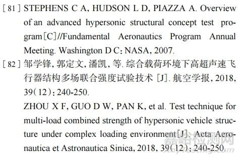 飛行器在飛行過程中結(jié)構(gòu)表面處于復雜多場耦合環(huán)境中,易誘發(fā)熱結(jié)構(gòu)的防隔熱性能、強度與疲勞失效。進行多場耦合環(huán)境下的地面結(jié)構(gòu)實驗能夠更好地模擬陶瓷基復合材料結(jié)構(gòu)的真實物理狀態(tài),建立完整的陶瓷基復合材料評估準則。典型的多場耦合實驗有熱/力/振耦合實驗、熱/力/噪耦合實驗、熱/振/噪耦合以及熱/力/振/噪四場耦合實驗等。張黎等[80]在熱振聯(lián)合實驗基礎(chǔ)上進行靜力加載技術(shù)的研究,設(shè)計具有靜力加載系統(tǒng)的力熱振聯(lián)合實驗平臺,并成功應用于大型力熱振聯(lián)合實驗任務(wù)。NASA蘭利研究中心具備可達175dB聲壓級和上千攝氏度高溫的熱/力/噪聯(lián)合實驗平臺,已用于評估X-37系列型號中C/SiC翼舵結(jié)構(gòu)在熱噪耦合作用下的結(jié)構(gòu)強度性能[81]。國內(nèi)以飛機強度所為代表的單位相繼開展了多場耦合環(huán)境下實驗設(shè)備的開發(fā)與應用,能夠針對金屬/復合材料元件及構(gòu)件開展0.8kN/1250℃/18t/166dB多場載荷條件的施加,對于1650℃以上的超高溫環(huán)境,目前的高溫傳感器無法較好地測量出相應的高溫應變等關(guān)鍵參數(shù),是今后仍需大力攻克的一個難題[79,82]。