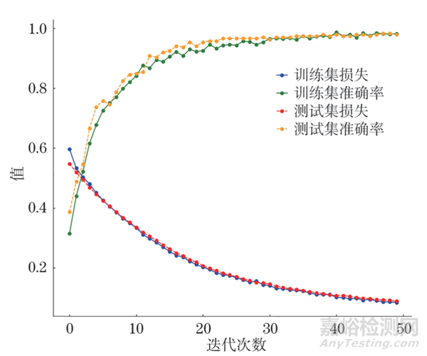 為驗(yàn)證所提模型的有效性,將數(shù)據(jù)集中數(shù)據(jù)輸入到所提模型中的1D-CNN模型進(jìn)行訓(xùn)練,訓(xùn)練過程中的訓(xùn)練集和測(cè)試集的損失率和準(zhǔn)確率散點(diǎn)圖如圖6所示,可見第30次迭代后準(zhǔn)確率穩(wěn)定在98%左右,這里的準(zhǔn)確率關(guān)系到SVM分類的準(zhǔn)確率,準(zhǔn)確率越高則后面輸入到SVM分類器中的提取特征越準(zhǔn)確。