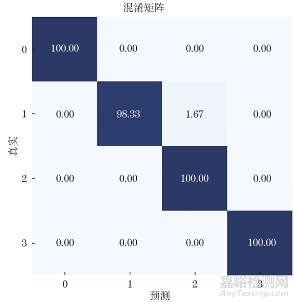 將1D-CNN模型提取到的特征輸入SVM分類器模型,得到分類準(zhǔn)確率為99.58%,混淆矩陣降維可視化結(jié)果如圖9所示,可以看到4種鋼絲繩中除了標(biāo)簽類別為1的測(cè)試集中有1.67%的數(shù)據(jù)被錯(cuò)誤識(shí)別(識(shí)別為標(biāo)簽為2的損傷類型),其余識(shí)別正確率均為100%。