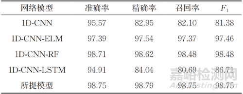 對(duì)比不同的深度學(xué)習(xí)模型,通過準(zhǔn)確率、精確率、召回率和F1值綜合評(píng)估其性能??梢园l(fā)現(xiàn),1D-CNN與1D-CNN-LSTM的準(zhǔn)確率較高,但精確率、召回率和F1值相對(duì)較低,同時(shí)可能存在一些分類誤差,尤其是在對(duì)缺陷的精準(zhǔn)度上有待提高。1D-CNN-ELM和1D-CNN-RF模型表現(xiàn)相當(dāng)穩(wěn)定,準(zhǔn)確率和精確率較高,但仍然有一些微小差異,所提模型在所有性能指標(biāo)上均表現(xiàn)卓越,準(zhǔn)確率、精確率、召回率和F1值都不小于98.75%,突顯了其在數(shù)字信號(hào)缺陷分類任務(wù)中的卓越性能。