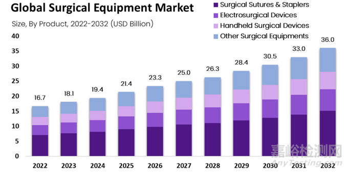 市場增長:手術(shù)設(shè)備市場預(yù)計到2032年將達(dá)到360億美元,從2022年的167億美元開始計算,年復(fù)合增長率(CAGR)為8.2%。