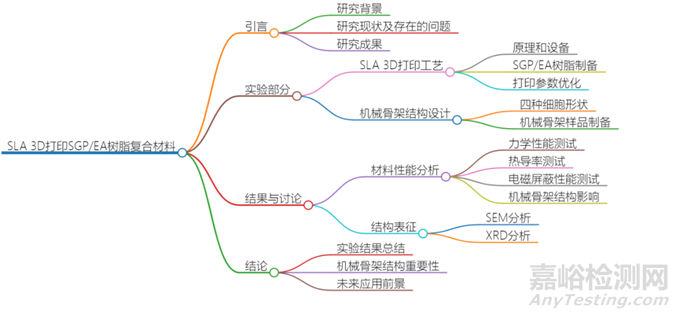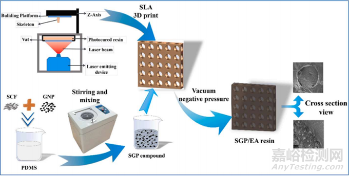 關(guān)于通過結(jié)合立體光固化(SLA) 3D打印技術(shù)和真空浸漬工藝來制備具有集成熱導(dǎo)性、電磁干擾(EMI)屏蔽和機(jī)械性能的SGP/EA樹脂復(fù)合材料的方法。通過SLA 3D打印技術(shù)制備了具有機(jī)械承載能力的EA樹脂骨架,然后采用均質(zhì)分散法制備了含有短切碳纖維(SCF)和氧化石墨烯納米片(GNP)的聚二甲基硅氧烷(PDMS)復(fù)合填料(簡稱SGP),并通過真空浸漬將SGP復(fù)合填料填充到EA樹脂骨架中,將復(fù)合樣品放入加熱箱中固化,從而得到最終的SGP/EA樹脂復(fù)合材料。這個過程確保了功能性填料在復(fù)合材料中的均勻分散,并通過設(shè)計(jì)的骨架結(jié)構(gòu)優(yōu)化了材料的綜合性能。