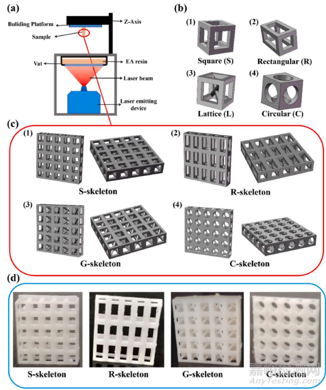 圖2 (a) LA-3D打印機(jī)的示意圖。(b) 為承重骨架設(shè)計(jì)了四種基于不同細(xì)胞形狀(方形(S)、矩形(k)、格子(L)和圓形(C))的機(jī)械骨架結(jié)構(gòu)單元,(C)(b)和(d)中四種不同細(xì)胞形狀的拓?fù)鋱D是通過SLA-3D打印得到的四種骨架樣品。