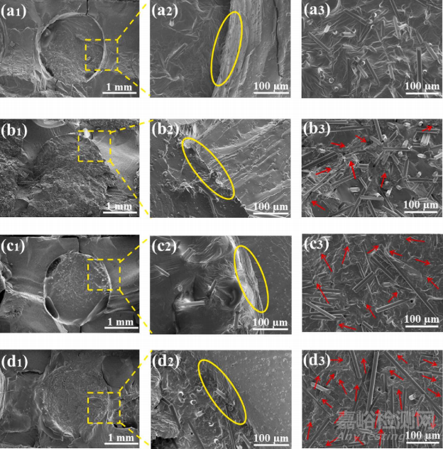 研究通過掃描電子顯微鏡(SEM)觀察了C-SGP/EA樹脂復(fù)合材料的截面形貌。結(jié)果顯示,不同GNP含量的SGP功能復(fù)合填料與機(jī)械承載骨架的界面結(jié)合良好,沒有明顯的界面分離。隨著GNP含量的增加,觀察到SCF和GNP在PDMS基體中形成了更多的層疊關(guān)系,這有助于形成微納尺度的協(xié)同效應(yīng),從而提高熱導(dǎo)網(wǎng)絡(luò)的形成。此外,盡管在樣品的兩相界面處觀察到孔洞,但這并非由于SGP復(fù)合填料的不完全填充造成,而是因?yàn)镾GP在樣品的脆性斷裂過程中被拉伸所致。SEM圖像中用紅色箭頭標(biāo)出了GNP的位置,并且箭頭的數(shù)量表示了SGP復(fù)合填料中GNP的含量。這些結(jié)果表明,通過均勻分散法制備的SGP復(fù)合填料在EA樹脂骨架中分布均勻,有助于提高復(fù)合材料的整體性能。