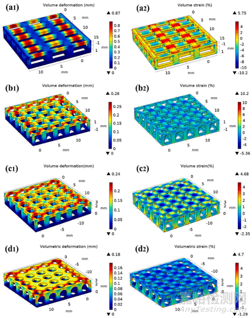 圖 4 展示了在 100 N 壓縮力下,四種不同機(jī)械承重骨架的體積變形 (1) 和體積應(yīng)變 (2) 云圖。(a-d 分別代表 R、L、S 和 C 骨架結(jié)構(gòu))。