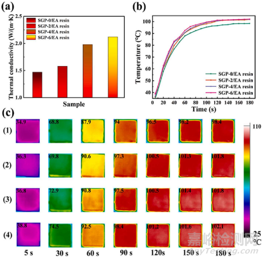 圖5 (a)不同GNP含量的SGP/EA樹脂復(fù)合材料樣品的導(dǎo)熱系數(shù)。(b)從0到180秒在110°C下SGP/EA樹脂化合物樣品的相應(yīng)表面溫度變化,(c)不同GNP含量SGP/EA樹脂化合物的紅外熱圖像。