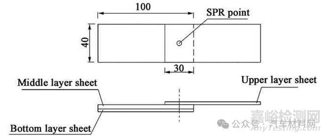 試驗材料為退火態(tài)5182鋁合金板材,表1所示為5182鋁合金的力學(xué)性能。鋁合金3層板的尺寸分別為為100 mm×40 mm×1.0 mm和100 mm×40 mm×1.5 mm兩種,3層板材的搭接方式如圖1所示,上層、中間層和下層鋁板的厚度分別為1.0、1.5和1.0 mm。