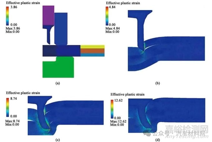 因此,在鉚接過程中,中間層板材受到的剪切力最大,上層板次之,底層板材受到的剪切力最小。3層板鉚接過程中,中間層板材的塑性變形最大,下層板材的塑性變形最小。在3層板材自沖鉚接頭設(shè)計過程中,應(yīng)優(yōu)先將塑性較好的材料作為中間層材料。