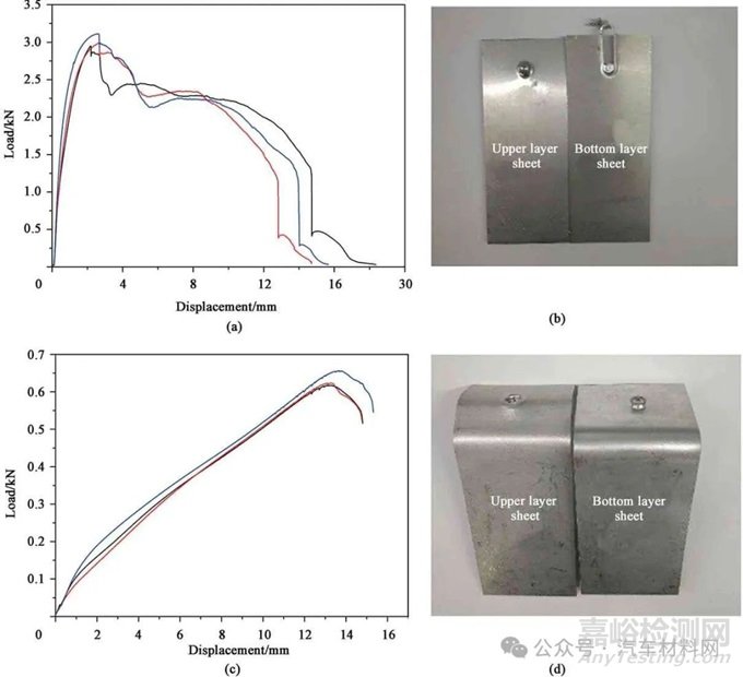 (a) Load-displacement curves of tensile-shear test (b) Fracture mode of tensile-shear sample (c) Load-displacement curves of peel test (d) Fracture mode of peel sample